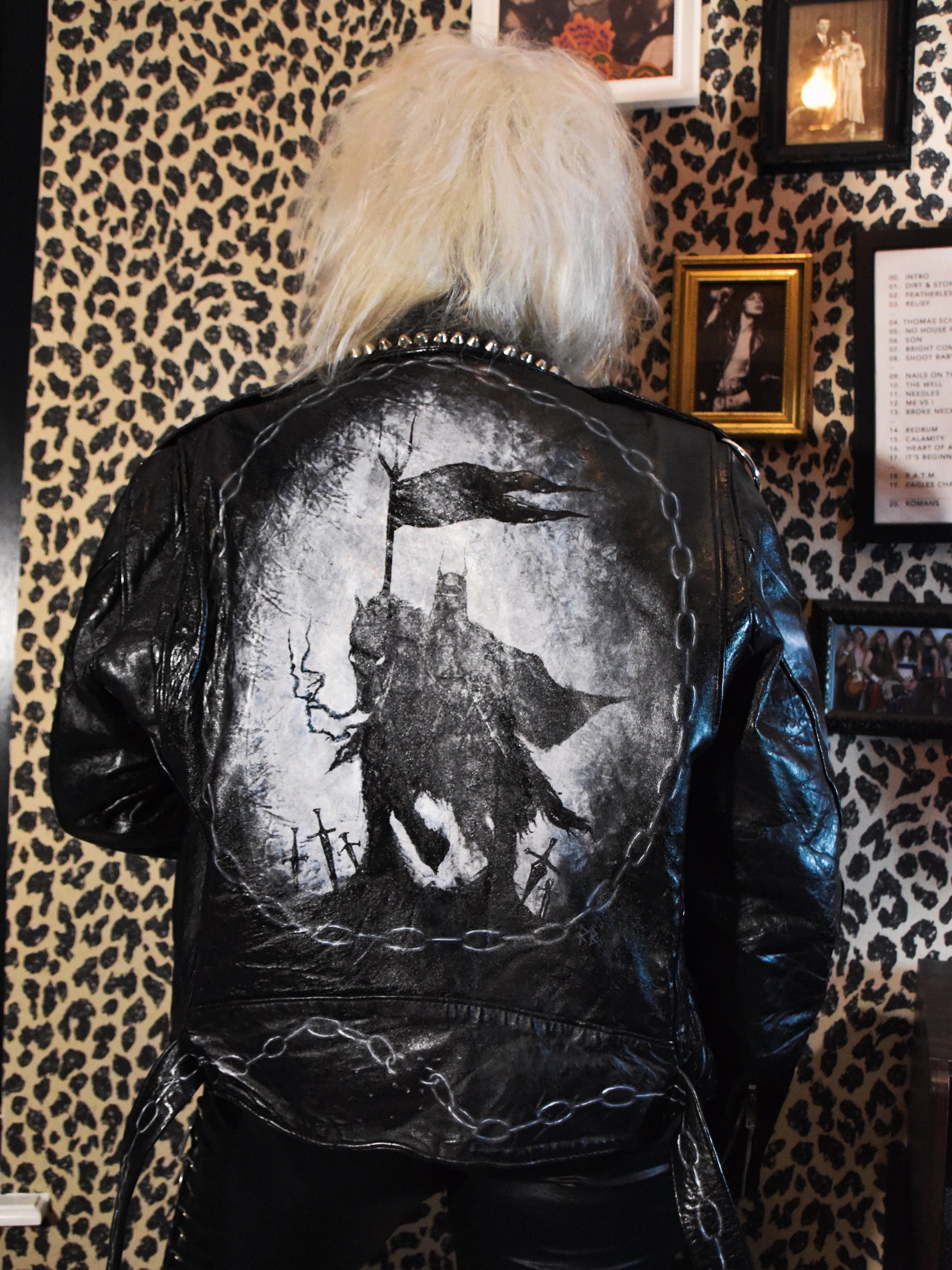 Real leather jacket featuring medieval themed paintings on the sleeves, front and back. Has studs on the collar and silver o-rings on the shoulders. Three zipped front pockets, one small key pocket and one pocket on the inside. Functional belt on the bottom and fully lined.